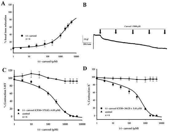Relaxant effect of (−)-carveol in the HUA on contractions sustained by 5-HT and KCL (60 mM). (A) Representative graph of the effect of (−)-carveol on the HUA basal tone. (B) Original layout showing the relaxant effect of (−)-carveol (1–5000 µM) on the spontaneous basal tone in the HUA. (C) Representative graph of the effect of (−)-carveol on contractions sustained by 5-HT (10 µM). (D) Representative graph of the effect of (−)-carveol on contractions sustained by KCl (60 mM). Values are expressed as the mean ± SEM; n = 6 (p < 0.05, one-way ANOVA followed by Holm–Sidak).