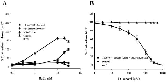 Relaxant effect of (−)-carveol on HUA and evaluation of the participation of voltage-operated calcium channels (VOCCs) and large conductance Ca2+ activated K+ channels (BKCa). (A) Effect of (−)-carveol (1000 and 2000 µM) on contractions evoked by exogenous BaCl2, where nifedipine (1 μM) was used as a positive control. (B) Representative graph of the effect of (−)-carveol on contractions sustained by 5-HT (10 µM) in HUA sections pre-incubated with TEA (10 mM). Values are expressed as the mean ± SEM; n = 6 (p < 0.05, one-way ANOVA followed by Holm–Sidak). Please correct the unit in the Figure 3B.