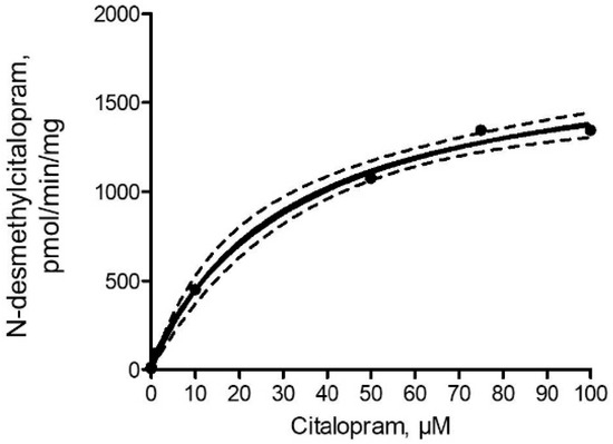 - Kobayashi, K.; Chiba, K.; Yagi, T.; Shimada, N.; Taniguchi, T.; Horie, T.; Tani, M.; Yamamoto, T.; Ishizaki, T.; Kuroiwa, Y. Identification of cytochrome P450 isoforms involved in citalopram N-demethylation by human liver microsomes. J. Pharm. Exp. Ther. 1997, 280, 927–933. [Google Scholar]