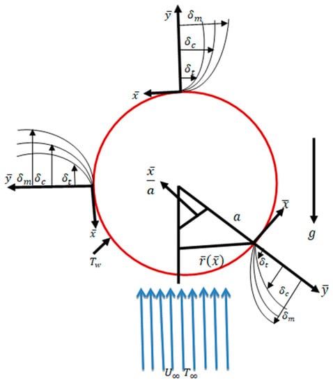 In steady, incompressible, laminar, viscous, and two-dimensional mixed convection flows along a sphere surface with a radius a, the temperature and mass concentration on the surface of the sphere are TW and CW, respectively, with conditions and , where and are the ambient temperature and mass concentration, respectively. The and coordinates are parallel and normal to the surface as shown in Figure 1. The corresponding velocity components in the and directions are and , respectively. The dimensionless flow equations are given below:
