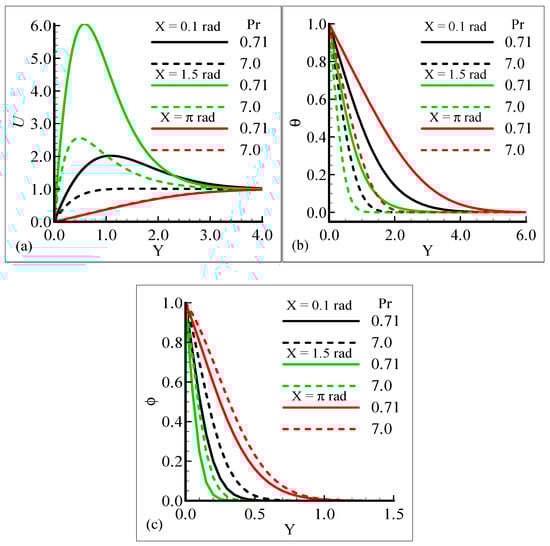 Figure 2a–c display the characteristics of the fluid velocity, the temperature of the domain, and the mass concentration for various values of the Prandtl number Pr around the surface of a sphere. From given plots, it is deduced that the velocity of the fluid flow is maximum at position X = 1.5 radian. We can infer that the temperature and mass concentrations are well behaved at position X = π radian for Pr = 0.71 and 7.0, respectively.