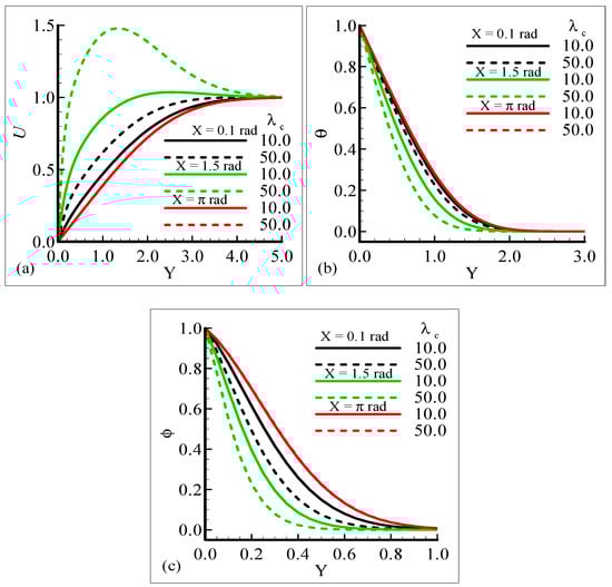 The impact of the various values of the modified mixed convection parameter, λC, on the concentration, velocity, and temperature distributions is given through the results illustrated in Figure 3a–c. The considered range for the modified mixed convection parameter is λC = 10.0 and λC = 50.0, and very much spans over a wide range of possible operating conditions, which were observed.
