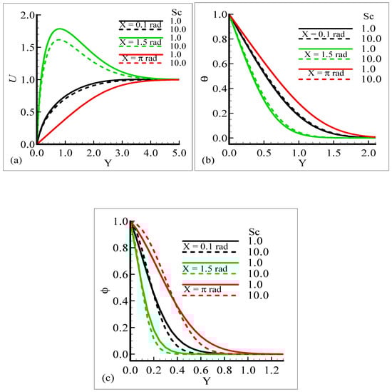 From the graphical results, it is predicted that an augmentation in Sc implies a significant decrease in the velocity and mass profiles and an increase in the temperature profile is observed. By viewing the behavior of the velocity, temperature, and mass profiles at several circumferential points around a sphere, it can be concluded that the velocity distribution attains a higher magnitude at X = 1.5 radian but the temperature and mass profiles achieve their higher magnitude at X = π radian. One noticeable point is that no difference is found in the velocity profile at X = π radian. The above said phenomenon takes place because with the increase of the Schmidt number, molecular diffusion is reduced, and viscous force is increased. It is predicted that with the increase of Sc, the viscosity of the fluid flow domain dominates the mass diffusion per unit volume, which reduces the fluid velocity at each position of the sphere.