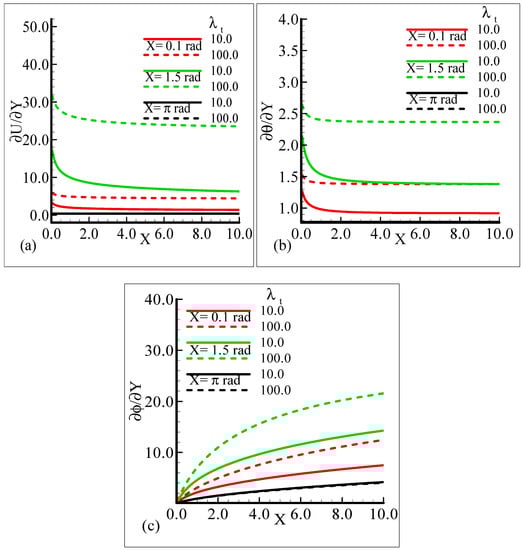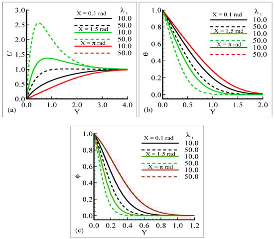 In Figure 6a–c, the behavior of the skin friction, heat transfer rate, and mass transfer rate for several values of the mixed convection parameter, λt = 10.0, 100.0, when the other parameters remain fixed is highlighted. We can see that as λt is enhanced, the slopes of the velocity, temperature, and mass concentration profiles increase at positions X = 0.1 radian and X = 1.5 radian around a sphere, but at position X = π radian, all of the three physical quantities show no reasonable change corresponding to an increase in λt.