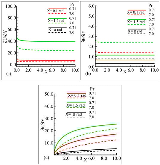 It can be observed that all three quantities are magnified at position X = 1.5 radian, and lower magnifications are noted at X = π radian. Figure 7a–b depict that for the Prandtl number Pr = 0.71 and 7.0, by keeping the other parameters fixed, skin friction decreases at X = 0.1 radian and X = 1.5 radian, but no change is observed at X = π radian.