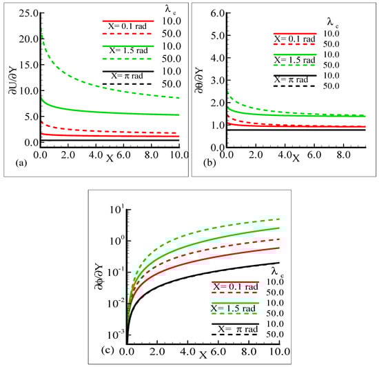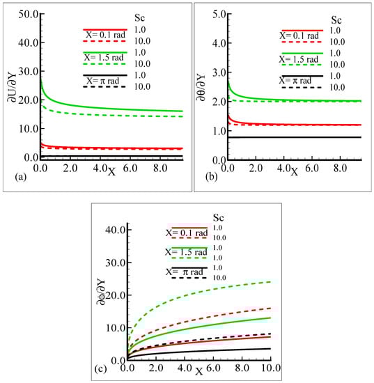 As Sc is increased, it gives rise to a loss of skin friction and the rate of heat transfer, and an increase in the rate of mass transfer is observed. It is shown that skin friction at position X = 1.5 radian achieves its maximum value and minimum value at X = π radian, and similar results are observed for the heat and mass transfer rates. Figure 9a–c elaborate on the effect of various estimations of λC on the skin friction, heat transfer rate, and mass transfer rate.