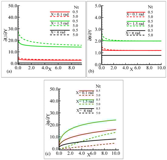 The behavior of the skin friction, rate of heat, and mass transfer under the influence of different values of the thermophoresis parameter, Nt, when other parameters involved in the flow model are kept fixed is highlighted in Figure 10a–c. It can be viewed that around different positions of a sphere, when the thermophoresis parameter increases, the skin friction and rate of heat transfer are enhanced but the mass transfer rate decreases.