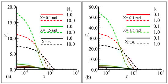 Figure 11a,b depict the influence of the thermophoresis parameter, Nt, and thermophoretic coefficient, κ, on the thermophoretic velocity, Vt, at three different stations around the surface of a sphere against the volume fraction of the submicron particles. In these figures, it is shown that the thermophoretic velocity at the surface of the sphere is higher at position X = 1.5 radian, and in both cases, it approaches zero as the fraction or particle size is increased. Further, the curves in the graph intersect at a horizontal axis due to the mixing attitude of the thermophoresis particles.