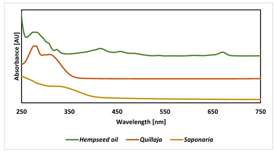 UV-Vis spectra of hempseed oil and 2 g/L water solutions of plant extracts from Saponaria officinalis and Quillaja saponaria.
