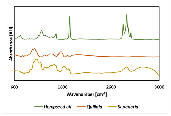 Infrared spectra of hempseed oil and used plant extracts from Saponaria officinalis and Quillaja saponaria.