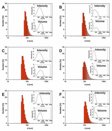 Based on our previous experience [10,41], we decided to present droplet size distribution by intensity, number and volume ratio (Figure 3). In our previous work [10] we suggested that during the DLS results analysis, the intensity of scattered light by particles should be considered for nanoparticles or droplet size characterization. One of the reasons for this is that the presence of even a few large particles (possible contaminations or samples with high PDI index) strongly affects the average particle’s diameter. One of the frequently used approaches for the elimination of this phenomena is the use of a filtration process. Unfortunately, additional processes might strongly affect the valuable information of the “real conditions” in the investigated samples. As a result, detailed particle/droplet size distribution evaluation, including the results for intensity and particle number versus particle size, were presented for the most stable samples (see Figure 3).