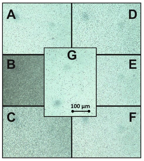An optical microscope was applied for the evaluation of the homogeneity of the samples with different concentarions of plant extract-derived surfactants. A high number of large droplets was observed in a light microscope in all samples (Figure 4A–G). No visible significant differences were observed in the reference sample, which was prepared without surfactant (Figure 4G). The uniformity of droplets might be caused lower oil concentration than in our previous research [44,45]. For detailed studies of droplet size and size distribution, we recommend using a confocal laser scanning microscope or scanning electron microscope with cryomode.
