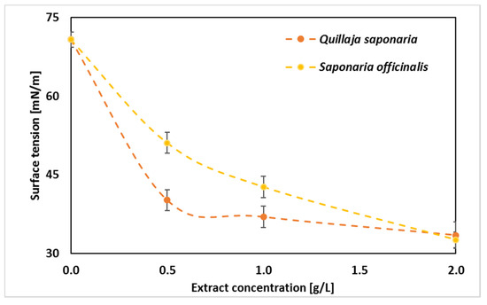 Further research focused on assessing the surface-active properties of the emulsion ingredients can be found in Figure 5. Considering the impact of this parameter on the formation of emulsions, it should be noted that this is not the only parameter determining this phenomenon. However, the lower the surface tension, the easier the oil phase is to disperse in the aqueous phase, and the stability of such a system can also be assumed. In the presented experiment, the tension at the interface between the liquid and air phase (surface tension) and at the interface between the water and oil phases (interface tension) was determined. When applied at 2.0 g/L, the extract from Saponaria officinalis reduced the surface tension of the aqueous solution slightly more than the extract from Quillaja saponaria (32.6 mN/m compared to 33.5 mN/m). At lower concentrations, Quillaja saponaria extract (40.2 mN/m at 0.5 g/L, i.e., 0.5 CMC) proved to be significantly more effective at reducing surface tension. Similarly, the values of the interfacial tension, at the interface with oil, slightly differed from those mentioned above and reached approx. 42 mN/m. The surface tension of the emulsions were also at a similar level (approx. 49 mN/m). The last results are especially interesting because the measurements of the surface tension of complex mixture are not frequent in the literature. Nevertheless, emulsion processing and transport in an industrial installation, e.g., in dispensing nozzles, where surface tension allows for calculating, among others, capillary forces present in them. And the results show that the type of extract used does not cause significant differences in the surface tension of the resulting emulsions.