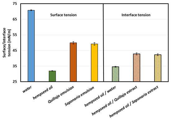 Surface tension of hempseed oil and water solutions of plant extracts from Saponaria officinalis and Quillaja saponaria at a concentration of 2 g/L and interface tension in the emulsion systems with and without surfactants.