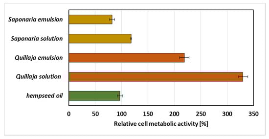Relative metabolic activity of Pseudomonas fluorescens ATCC 17400 exposed to hempseed oil and water solutions and emulsions of plant extracts from Saponaria officinalis and Quillaja saponaria, with the metabolic activity in control sample set as 100% (SD presented as error bars).