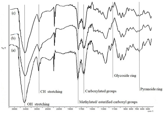 Figure 1. FTIR spectra of pectins in the 400 to 4000 cm−1 region. Spectra of pectins from jujubes (PJ) of first harvesting, PJ1 (a), second harvesting, PJ2 (b) and third harvesting, PJ3 (c).