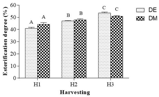 Figure 3. Effects of harvesting (H1, H2, and H3) on esterification degree determined by titrimetric (esterification degree determined by titration method, DE) and instrumental methods (esterification degree determined by instrumental FTIR method, DM). Error bars represent standard deviation (n = 3). Values with the same letter are not significantly different, while values with different letters are significantly different (DE: H1 vs. H2, ** p < 0.01, H1 vs. H3, **** p < 0.0001, H2 vs. H3, ** p < 0.01; DM: H1 vs. H2, ** p < 0.01, H1 vs. H3, ** p < 0.01, H2 vs. H3, not significant, ns).