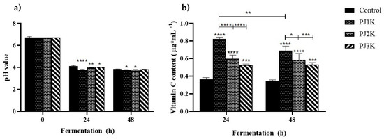 Figure 4. Evolution of pH (a) and vitamin C content (b) during fermentation, in control and pectin-supplemented kefirs. PJ1K: Kefir added with PJ1. PJ2K: Kefir added with PJ2. PJ3K: Kefir added with PJ3. Values represent the mean of three independent experiments (each done in triplicate) ± standard deviation. Asterisks on the bars indicate that mean values were statistically different from the control, while asterisks on the dashes indicate differences among different treatments or the same treatment at different time points (* p < 0.05, ** p < 0.01, *** p < 0.001, and **** p < 0.0001).