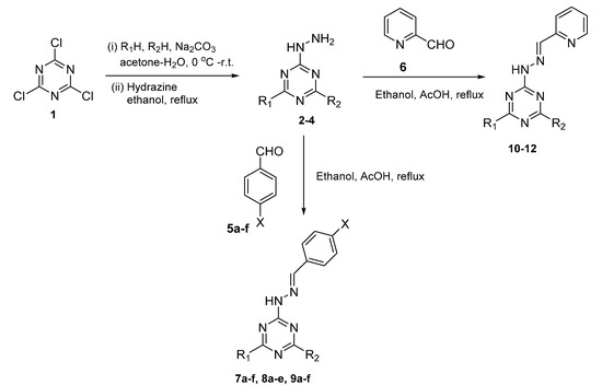- Barakat, A.; El-Senduny, F.F.; Almarhoon, Z.; Al-Rasheed, H.H.; Badria, F.A.; Al-Majid, A.M.; El-Faham, A. Synthesis, X-Ray Crystal Structures, and Preliminary Antiproliferative Activities of New s-Triazine-hydroxybenzylidene Hydrazone Derivatives. J. Chem. 2019, 2019. [Google Scholar] [CrossRef]