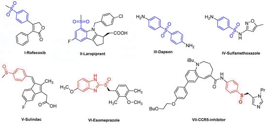 A non-exhaustive panel of examples is presented in Figure 1: an arylsulfone moiety is present in drugs like Rofecoxib (I) [4], Laropiprant (II) [5], Dapson (III) [6], and Sulfamethoxazole (IV) [7], while examples of arylsulfoxides (even if less distributed due to their relative instability) can be found in Sulindac (V) a clinically used anti-inflammatory drug [8], in esomeprazole (VI), the S enantiomer of omeprazole [9], and in a recently reported compound (VII) with anti-HIV activity [10].