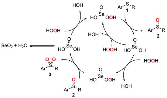 A 0.5 M solution of the substrate 1a in ethyl acetate (Solution A) and a 0.05 M solution of SeO2 in water in the presence of the different amounts of H2O2 reported in Table 1 (Solution B), were fluxed through a Y junction in a 2 mL tubular reactor, at four different flow rates corresponding to residence times of 6.5, 10, 20 and 100 min. The chemoselectivity seemed to be influenced predominantly by the amount of hydrogen peroxide (Entries 1–5 vs. Entries 6–8). In entries 3–5 the conversion yield for the formation of the sulfoxide 2a increased with the reduction of the flow rate from 0.3 mL/min to 0.1 mL/min and, in these conditions, using 2 equivalents of hydrogen peroxide, the target compound (2a) was obtained in an 85% yield and with 100% chemoselectivity. When the reaction was repeated in the same conditions but without SeO2, only the starting material was observed in the 1H-NMR spectrum of the crude product, confirming the catalytic role of selenium. Increasing the amount of hydrogen peroxide from 2 (entry 5) to 5 (entry 7) and 10 (entries 7,8) equivalents also increased the formation of the sulfone 3a, which was quantitatively obtained as a unique reaction product when the reaction was carried out in the presence of 10 equivalents of H2O2 at both 0.1 and 0.2 mL/min (entries 7,8). The proposed mechanism for the catalytic cycle is reported in Scheme 2. Selenium (IV) oxide in water is in equilibrium with the hydrated form which is particularly prone to oxidation by hydrogen peroxide, affording the corresponding peroxyselenic (IV) acid as the actual catalyst in the formation of both the sulfoxide 2 and sulfone 3, depending on the amount of the oxidant.