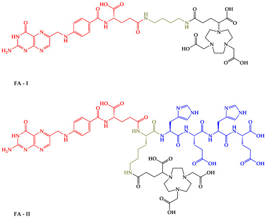 Chemical structure of FA-I and FA-II with marked moieties: red-folic acid vector moiety; black–NODAGA chelator for 68Ga coordination; green–linkers; blue–(HE)2-tag for pharmacokinetic properties optimization.