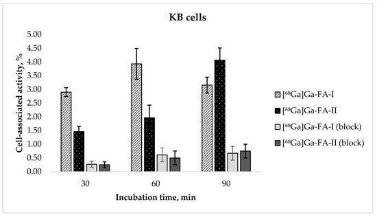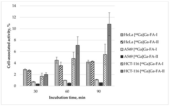 Alongside with KB cells widely used for folate-based radiopharmaceuticals in vitro accumulation studies, [68Ga]Ga-FA-I and [68Ga]Ga-FA-II uptake was also evaluated for HeLa (FR(+), as progenitor of KB cells [35]), A549 (FR(−); as control) and HCT-116 (FR(+) [36,37]) cells. The results of these in vitro tests are presented in Figure 3.