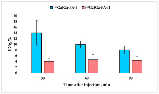 It is noteworthy that while [68Ga]Ga-FA-I biodistribution is characterized by a systematic decrease in kidney uptake over time, for [68Ga]Ga-FA-II this value practically does not change over time (30–120 min after administration) and equals 4.3 ± 1.1% ID/g (p > 0.05).