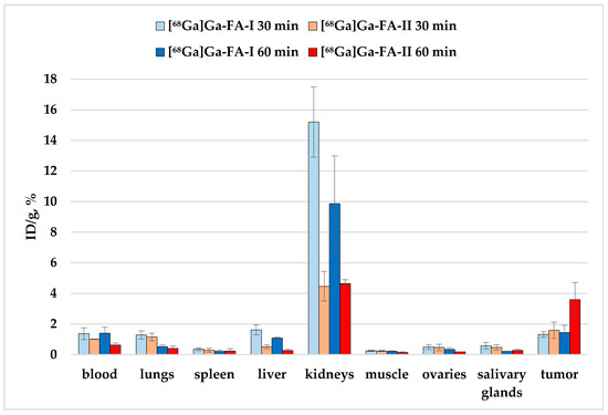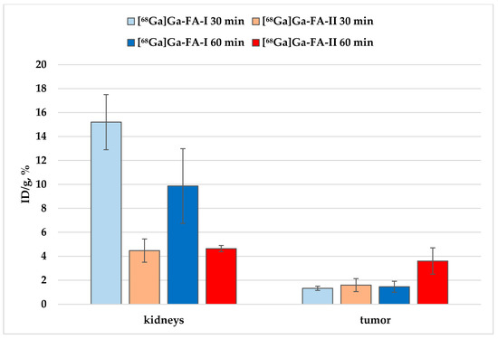 As already mentioned, the experimental data (Figure 5) convincingly demonstrate that, with the exception of tumor foci, the accumulation of [68Ga]Ga-FA-II in the important organs and tissues is lower than that of [68Ga]Ga-FA-I. Thus, the tumor/healthy tissue ratio for [68Ga]Ga-FA-II is higher than that for [68Ga]Ga-FA-I (Table 4, p > 0,05 after 30 min, p < 0,01 after 60 min). The accumulation of both compounds in the kidneys was quite high and significantly exceeded the accumulation in the tumor foci (Figure 6).