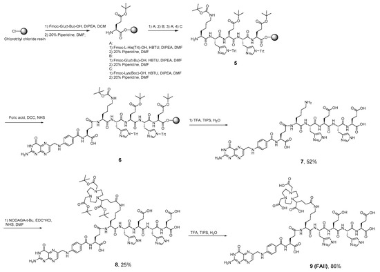 4.4. Synthesis of NODAGA-[Lys-(HE)2]--Folic Acid (9 in Scheme 2, FA-II)