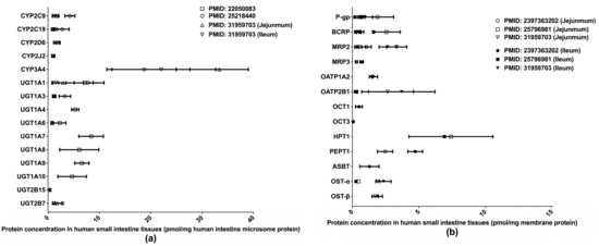 Extant quantifications of human intestinal DMET proteins are summarized in Figure 2. Among those proteins, CYP3A4 and HPT1 are the most abundant enzyme and transporter, respectively. Two studies [32,33] determined the abundances of major clinically relevant DMEs in isolated human small intestine microsomes (HIMs) without regard to intestinal segments, whereas a more recent study [36] measured DME expression levels separately in the jejunum and ileum. Drug transporter protein expressions have likewise been measured separately in the jejunum and ileum [36,37,38]. A recent study [39] quantified multiple drug transporters in additional intestinal segments, including the duodenum, jejunum, ileum, and colon, and identified a segment-dependent expression pattern for the transporters [39]. The differences in drug transporter expression across intestinal segments may contribute to varied absorption rates for oral drugs at different intestinal segments and lead to the multiple-peaking phenomenon observed in the plasma drug concentration-time profiles of some medications [40]. Proteomics data describing the intestinal transporter distribution would be of great help in understanding drug oral absorption features and in optimizing the designs of drug delivery systems and formulations.