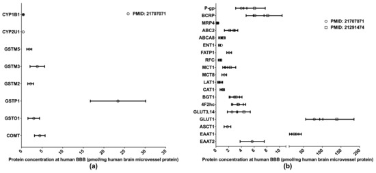 The BBB is formed of the endothelial cells of brain microvessels and characterized by the presence of intercellular tight junctions. The BBB was previously viewed as an anatomical barrier between the blood and the brain [41] and is now also considered a pharmacological barrier because a range of DMETs are expressed at the BBB. These DMETs are involved in drug metabolisms and the uptake and efflux of a variety of drugs across the BBB, hence affecting drug distribution in the brain [42,43]. Brain drug distribution is associated with the efficacy and side effects of drugs for the treatment of many diseases, such as brain tumors, HIV-1 infection, and psychiatric disorders [44]. Therefore, obtaining DMET protein expression profiles at the BBB will provide more insights into the role of the BBB in regulating the pharmacological effects of central nervous system medications; and the information will also aid in drug development and the optimization of pharmacotherapy. Relative to human hepatic and intestinal DMET proteomics, the proteomics of human BBB DMETs was understudied. The quantifications of clinically relevant DMETs at the human BBB are illustrated in Figure 3. One study determined the abundance of several DMEs [45], and two reported the levels of major transporters [45,46]. Among the reported DMETs, the phase II enzyme GSTP1 exhibited a considerably higher level of expression. GLUT1 and EAAT1 were found to be the two most abundant uptake transporters, whereas BCRP and P-gp were among the most abundant efflux transporters.