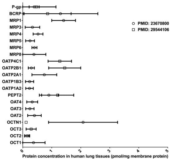 - Sakamoto, A.; Matsumaru, T.; Yamamura, N.; Uchida, Y.; Tachikawa, M.; Ohtsuki, S.; Terasaki, T. Quantitative expression of human drug transporter proteins in lung tissues: Analysis of regional, gender, and interindividual differences by liquid chromatographytandem mass spectrometry. J. Pharm. Sci. 2013, 102, 3395–3406. [Google Scholar] [CrossRef]