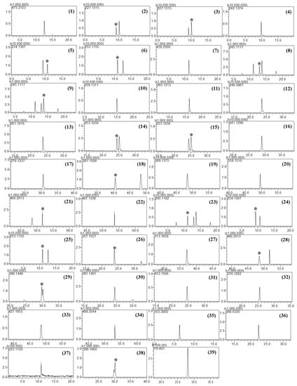 Extracted ion chromatograms of PDE-5 inhibitors and their analogs: Sildenafil (1), carbodenafil (2), demethylhongdenafil (3), hydroxyhongdenafil (4), hongdenafil (5), hydroxyhomosildenafil (6), piperidinohongdenafil (7), homosildenafil (8), dimethylsildenafil (9), udenafil (10), cyclopentinafil (11), thiosildenafil (12), hydroxythiohomosildenafil (13), thiohomosildenafil (14), dimethylthiosildenafil (15), oxohongdenafil (16), benzylsildenafil (17), hydroxychlorodenafil (18), chlorodenafil (19), nitrodenafil (20), nor-neosildenafil (21), dichlorodenafil (22), vardenafil (23), acetylvardenafil (24), hydroxyvardenafil (25), nor-neovardenafil (26), desulfovardenafil (27), pseudovardenafil (28), tadalafil (29), aminotadalafil (30), acetaminotadalafil (31), demethyltadalafil (32), chloropretadalafil (33), N-octyltadalafil (34), yohimbine (35), mirodenafil (36), thioquinapiperifil (37), xanthoanthrafil (38), and phenolphthalein (39). * indicated the analytes among multiple peaks in the EIC.