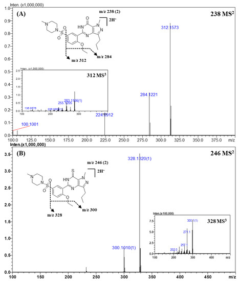 In the case of thiosildenafil derivatives (Figure 2B), the proposed fragmentation mechanism was almost the same as that described above; fragment ions of m/z 328.1344 (C17H19N4OS) and m/z 300.1022 (C15H15N4OS) were formed by C-S bond cleavage and subsequent detachment of the ethyl moiety. The mass of the fragment ions was 16 Da lower than that of the fragments from sildenafil; this difference was attributable to the presence of the thioketone moiety, whose mass was 16 Da higher than that of the ketone moiety in sildenafil.