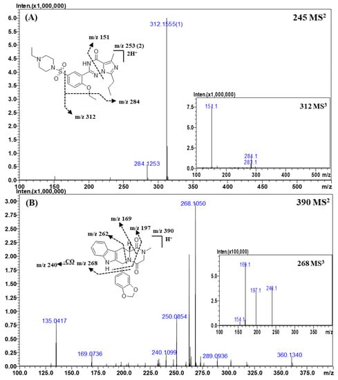 Representative MSn (n = 2, 3) spectra and proposed fragmentation mechanisms of vardenafil (A) and tadalafil (B). The bracketed numbers next to the m/z values indicate the charge state of the ions.