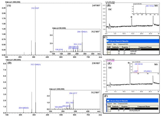 MSn (n = 2, 3) spectra, total ion chromatograms, and library search results for real samples. (A) MS2 and MS3 spectra of sample 1, (B) chromatogram and corresponding MS spectrum of sample 1, (C) library search result for sample 1, (D) MS2 and MS3 spectra of sample 2, (E) chromatogram and corresponding MS spectrum of sample 2, and (F) library search result for sample 2.