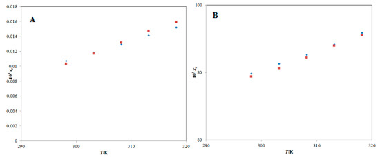 Here, GE = excess Gibbs energy and HE = excess enthalpy. The GE and HE values were computed using the activity coefficient-based Wilson model by applying Equations (11) and (12) [56,57] as follows: