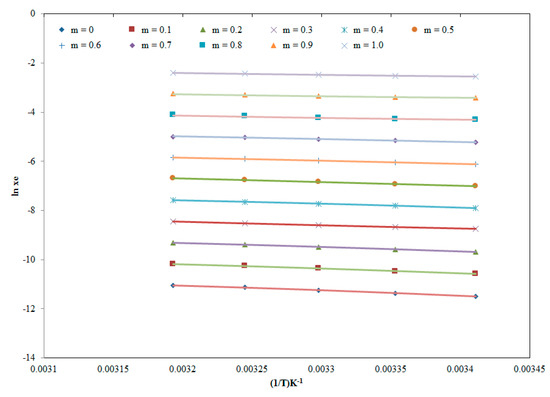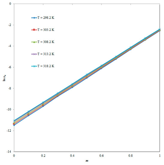 in which a and b = model coefficients of Equation (15), which were determined by the graphs constructed between ln xe of PPN and 1/T. The correlation between xe and xVan’t values of PPN was carried out using RMSD and R2. The RMSDs of for PPN were calculated using its formula reported previously in the literature [27]. The xApl value of PPN in various “THP + water” combinations including pure water and pure THP was calculated using Equation (16) [43,44].