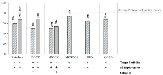Finally, we want to rationalize the advances and performances of docking programs applied to nucleic acids along the history, which refers to works retrieved from the literature [57,71,72,73,74]. However, we have to warn the reader that literature on docking programs applied to nucleic acids is less abundant compared to protein docking and because of the small data set used, sometimes, an appropriate statistical comparison results in being difficult. Indeed, our purpose is to emphasize the evolution and the ameliorations introduced in nucleic acids docking, rather than comparing different program’s performances. A recapitulating chart is made with the intent of a figurative appreciation of the different studies (Figure 5).