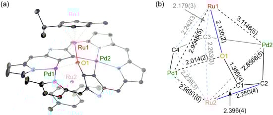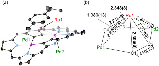 During the optimization of the reaction conditions, we found that a trace amount of oxygen-inserted triple-decker complex 6 was formed upon reaction of 5 with [RuCl2(p-cymene)]2 in air (Scheme 2). The HR-APCI-TOF MS gave the molecular ion peak of 6 at m/z = 2153.8690 (calcd. for C86H36F30N6O106Pd2102Ru2, [M]−: 2153.8682). The yield of 6 was improved up to 35% when the reaction was run in the presence of an excess amount (ca. 555 eq.) of water. However, the reaction in the presence of H218O did not afford the corresponding 18O-incorporated product, indicating that the oxygen source might be molecular oxygen. X-Ray crystallographic analysis revealed that the oxygen atom was actually inserted between the β-carbon (C1) and Ru1 (Figure 5). The Pd1–Ru1, Pd1–Ru2, Pd2–Ru1, and Pd2–Ru2 bond lengths are 2.9548(5), 2.9651(6), 3.1146(6), and 2.8568(5) Å, respectively, all being shorter than the sums of the van der Waals radii of Pd and Ru [20]. Density functional theory (DFT) calculations [21] also indicated the weak coordinating interactions between the Ru and Pd (Table S2). The oxygen atom (O1) is bound to Ru1 (2.120(2) Å), C1 (1.355(4) Å), and Pd1 (2.014(2) Å). Ru1 is π-coordinated to the C3-C4 bond and σ-coordinated to O1. Ru2 is π-coordinated to the C3–C4 bond, relatively strongly coordinated to C2 (2.250(4) Å) and weakly coordinated to C1 (2.396(4) Å).