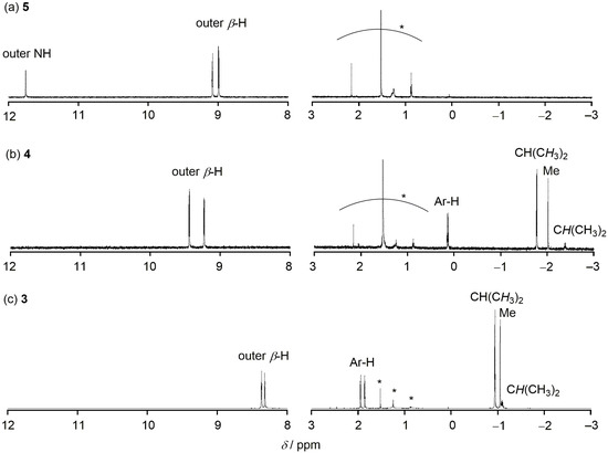 1H-NMR spectra of (a) 5, (b) 4 and (c) 3 in CDCl3 at room temperature. Asterisks mean residual solvent and impurity.
