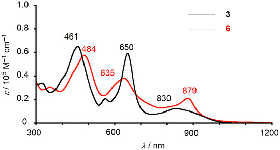 Absorption spectra of 3 (black) and 6 (red) in CH2Cl2.
