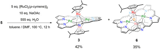 Expanded porphyrins which consist of more than four pyrrole units and methine carbons, have been attracting continuous attention due to their intriguing optical and electrochemical properties, structural diversities, and rich coordination abilities [1,2,3,4,5,6,7]. The structural and electronic characteristics of expanded porphyrins are usually quite flexible, which has been used for versatile and efficient modulation of aromaticity by redox reactions and structural modifications [5,6,7]. Recently, we report a new π-metal coordination type, wherein a (p-cymene)RuII fragment is η5-coordinated at the side pyrrole of bis-Au(III) [28]hexaphyrin, forming double-decker π-ruthenium complexes 1 and 2 (Figure 1) [8]. On the other hand, triple-decker π-ruthenium complex of bis-Pd(II) [26]hexaphyrin 3 possesses two (p-cymene)RuII fragments sitting on the two PdII metal centers and the inner pyrrolic β-carbon atoms in a η6-coordinated manner on both sides of the hexaphyrin. In the literature, π-metal complexes of porphyrinoids have been limited to those based on porphyrin, porphycene, subphthalocyanine, and subporphyrazine scaffolds [9,10,11,12,13,14,15,16], and no examples had been reported for expanded porphyrin π-metal complexes before our report [8]. Interestingly, complexes 1 and 2 showed attenuated macrocyclic paratropic ring currents, probably due to the coordination-induced attenuation of the global conjugation circuit, while complex 3 showed distinct 26π aromaticity. This difference suggested that the balance between macrocyclic aromaticity (i.e., 26/28π) and local aromaticity (i.e., 6π) is important and can be modulated by metal π-complexation [17]. This finding drove us to explore new π-ruthenium complexes of hexaphyrin. Here we report double-decker bis-Pd(II)[26]hexaphyrin π-ruthenium complex 4 and oxygen-inserted triple-decker bis-Pd(II) [26]hexaphyrin 6. Both complexes show a distinct diatropic ring current.