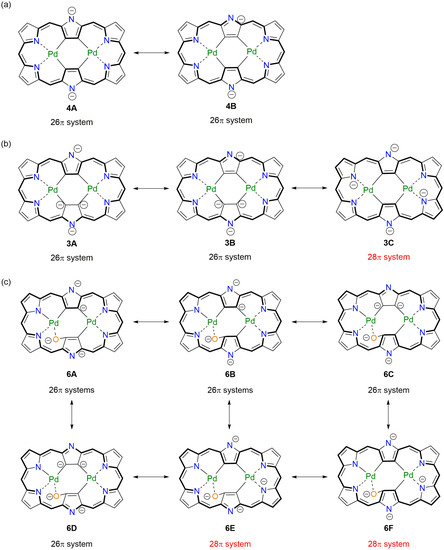 In order to understand the real electronic states, we assumed several resonance contributors in 3, 4, and 6 as shown in Scheme 3. For 4, two resonance contributors can be considered, both of which have 26π conjugation circuits regardless of the involvement of anions. As is the case in freebase hexaphyrins [22,23] and hexaphyrin bis-Pd(II) complex [19], the aromaticity of hexaphyrin dianion species becomes stronger than that of the neutral species. In contrast, the tetraanion of the hexaphyrin core in 3 can be drawn with three resonance contributors, one of which has a 28π antiaromatic circuit. In order to estimate the relative contributions, the harmonic oscillator stabilization energies (HOSE) [24] have been calculated based on the crystal structures. The estimated weights for the canonical structures 3A, 3B, and 3C are 0.342, 0.334 and 0.325, respectively. The calculated electrostatic potential map of 3 displayed relatively electronegative positions being roughly consistent with these canonical structures (Figure S19). Therefore, it could be assumed that non-negligible antiaromatic contribution caused the outer β-protons of 3 slightly upfield-shifted in the 1H-NMR spectrum as compared with 4, in which both of the 26π resonance contributors are estimated to be almost equally contributed (0.481 and 0.519 for 4A and 4B, respectively). With regard to 6, six resonance contributors are considered as shown in Scheme 3c. The estimated weights for the canonical structures 6A to 6F can be estimated to be 0.189, 0.182, 0.168, 0.162, 0.152, and 0.147, respectively. Similarly to the case of 3, the resonance contributors with 26π systems (6A and 6B) are more important than those with 28π systems (6E and 6F).