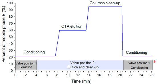 Step elution gradient for the analysis of OTA (Ochratoxin A) by an extraction microcolumn coupled to UPLC–MS/MS, indicating the mobile phase composition in the UPLC pumps, A: H2O:0.1% formic acid and B: ACN (Acetonitrile): 0.1% formic acid (blue line). The box below the gradient indicates the configuration of the switching valve (*).