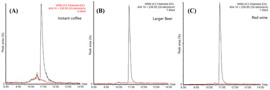 The proposed method was evaluated with samples of instant coffee, beer, and red wine, with OTA spiked at 2 µg L−1 to verify its applicability to them and the OTA response in each one. Table 1 shows the comparison of the signal-to-noise (S/N) ratio obtained from the different matrices at the same concentration, and the corresponding chromatograms are shown in Figure 2. The SRM (selected reaction monitoring) chromatograms (Figure 2), corresponding to the OTA’s highly selective MS/MS transition, show that the method can be applied to OTA determination in instant coffee, beer, and wine. The OTA retention time signal was observed at 11.2 min, without any interferent peak being detected. The analysis of wine and beer was more straightforward than for coffee, as these samples were already in the liquid state, requiring just degassing and filtering before injection into the system. This reduced the sample preparation time compared to instant coffee, which needed to be dissolved in hot water, centrifuged, and filtered before the injection.
