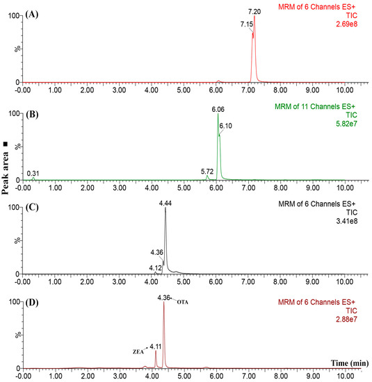 Firstly, the liquid chromatographic separation between our two initial compounds (OTA and ZEA) was investigated by injections of a standard solution, containing both analytes, at a concentration level of 15 µg L−1. Figure 3 depicts the obtained results (from A to D), through which the improvements obtained in the resolution, analysis time, as well as a reduction in peak band broadening, can be seen. In this case, the progress is attributed to the chromatographic parameters that were modified between these injections. The trace (A) in Figure 3 was conducted in isocratic mode using a mobile phase composition of ACN:H2O (30:70, v/v), without being acidified. This isocratic elution mode can explain the higher elution time observed in this case. As it is known, electrospray ionization (ESI, in this case operating in positive mode) can be highly influenced by the pH or the presence of matrix interferents. Thus, the weak signal observed for ZEA (a small peak near 6 min) could be improved by decreasing the pH and favoring ionization, as observed in Figure 3B, where the ZEA signal was enhanced by the addition of 0.1% formic acid on both mobile phases. Additionally, the reduction in the retention times could be attributed to the use of the elution gradient instead of isocratic mode. The following step consisted of improving the resolution between the peaks, as well as fixing the subtle break on top of the OTA peak (Figure 3B,C). For this purpose, the mobile phase flow rate increased from 8 µL min−1 to 10 µL min−1 to diminish the peak width, while an elution gradient that was steeped less was applied to maintain the separation between the ZEA and OTA. Finally, the chromatogram showed in (D) was achieved by keeping the mobile phase flow rate at 10 µL min−1. Additionally, the formic acid percentage was increased to 0.5%, and the elution gradient was slightly modified by enhancing the ACN percentage, while decreasing the gradient steepness curve (Figure S3, Supplementary Materials).