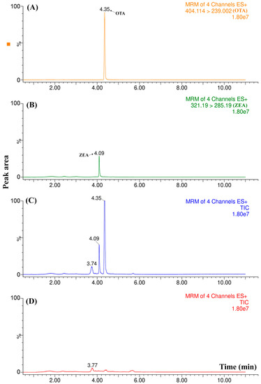 Representative chromatograms comparing a blank wine sample with one spiked at a concentration of at 15 µg L−1. (A) OTA ion transition; (B) ZEA ion transition; (C) total ion chromatogram of the spiked wine; and (D) total ion chromatogram of the blank wine sample.