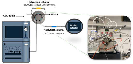 In this case, setup 2 was composed of an Acquity M-Class for liquid chromatography supplied with a µ-Binary solvent manager (pumping system), a sample manager (injector), and a trap valve manager (switching valve) coupled to a Xevo TQ S Micro (MS/MS), the whole equipment setup was acquired from Waters (Milford, MA, USA). Figure 7 shows a representative scheme of the assembled system on the right, while an actual photograph of the capillary extraction column connected to the trap valve manager is enlarged on the left.